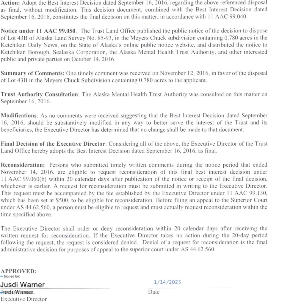 Best Interest Decision Affirmed – Negotiated Land Sale – Meyers Chuck MHT 9100853 January 15, 2025 MH Parcel CRM-2546